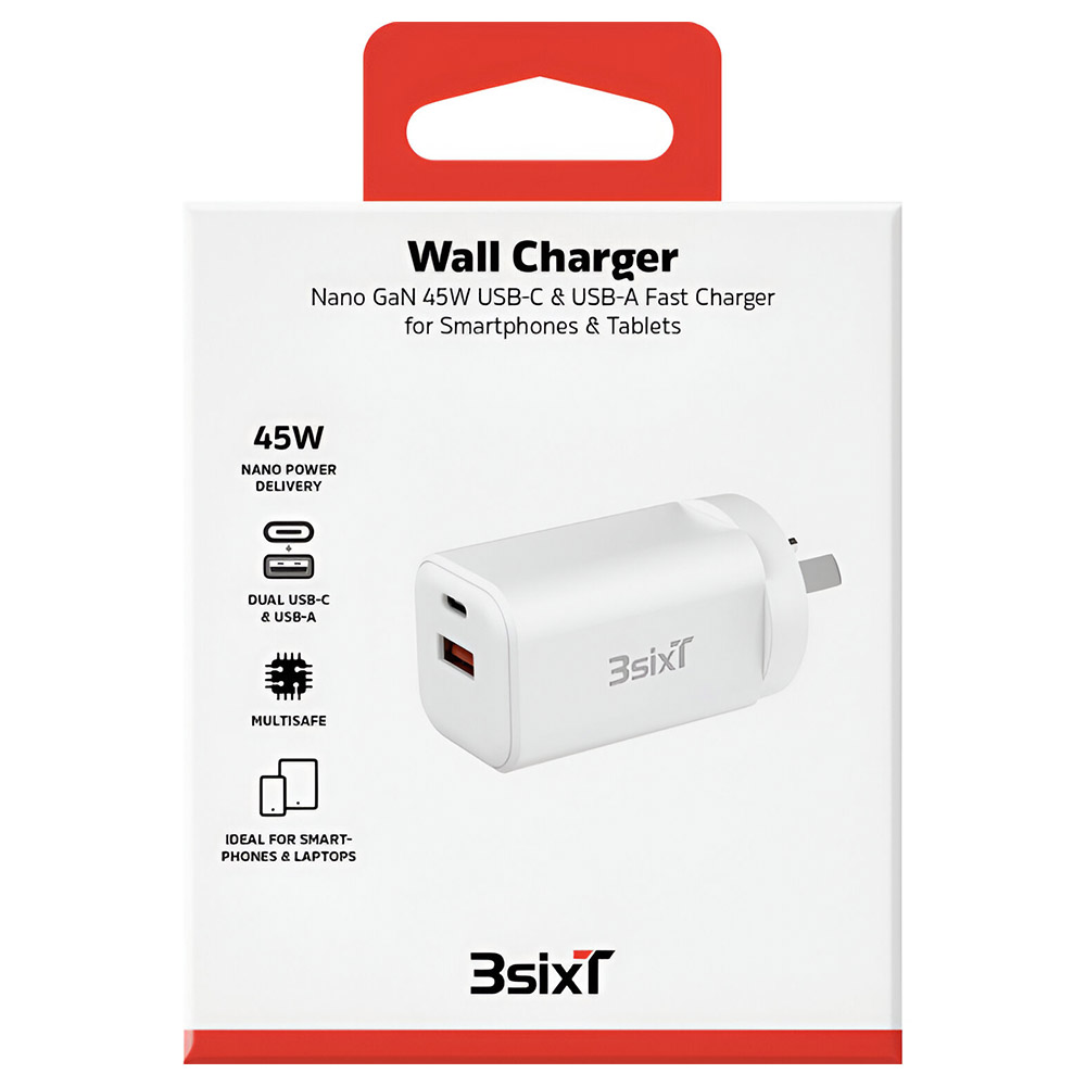 3sixT Wall Charger GaN 45W USD-C & USB-A + 2.4A – White